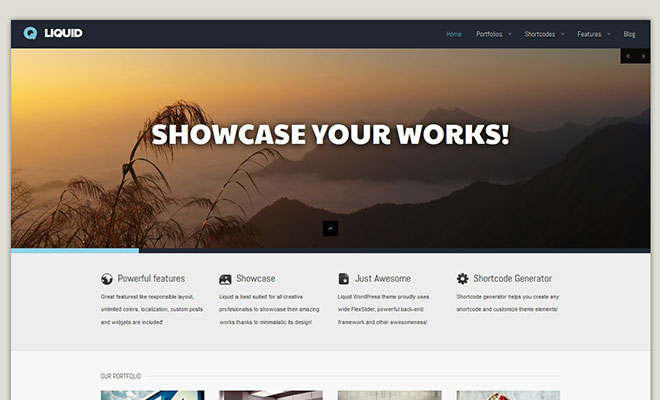 Liquid – sleek, solid and clean portfolio WordPress theme offers full responsive layout for all mobile devices and tablets. Theme includes big and awesome slider, lots of advanced features and functions and is based on solid backend framework.