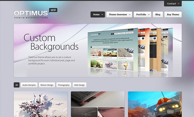 Optimus is a modern, powerful and professional responsive portfolio theme suited for users who want to showcase their work. Optimus is a perfect theme for creative agencies, freelancers, web designers, photographers and videographers.
