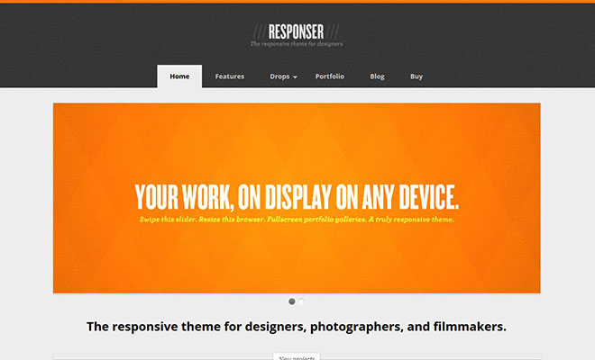 Responser displays your work beautifully on every screen. The world went mobile, now your portfolio can too. Portfolios are about one thing, your work. And responsive portfolios should display that work well on any screen. That’s why this theme shows your portfolio images in fullscreen and swipe-enabled on mobile and in a lightbox on desktop.
