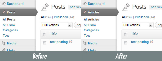 When creating a WordPress powered website for a client you may find that the default WordPress admin navigation menu label of Posts can be confusing when the client is attempting to create news content. A more suitable replacement menu label to use instead of Posts and one which a client should instantly recognise is Articles.
