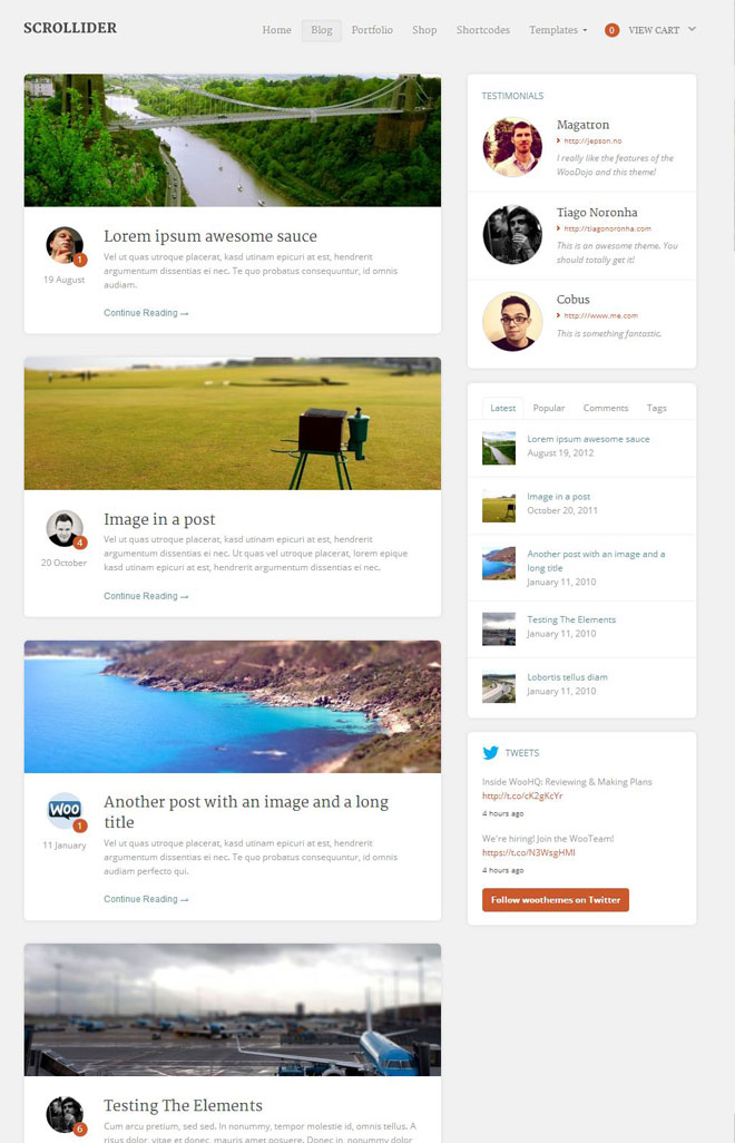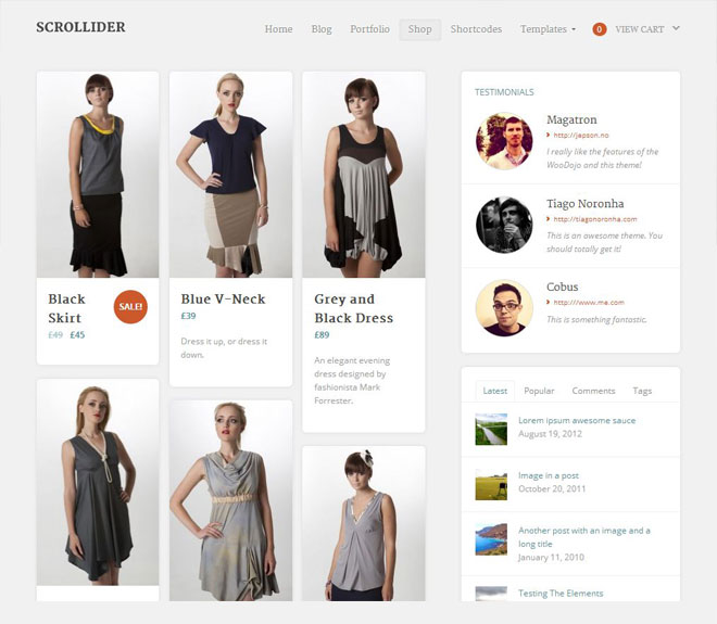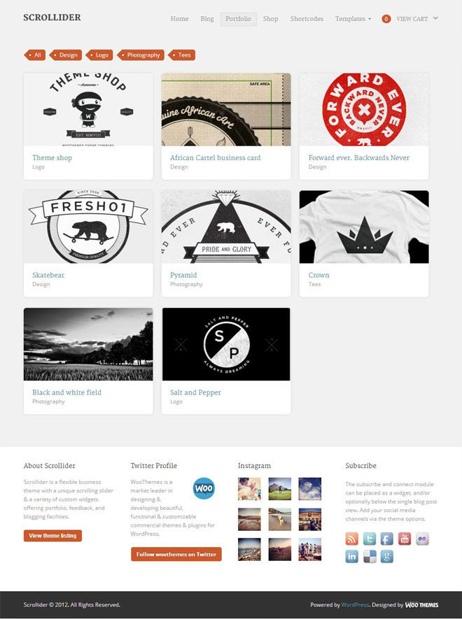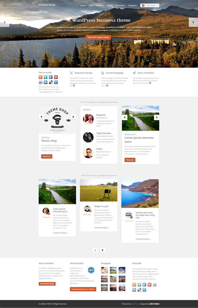 Scrollider from WooThemes is a modern WordPress business / portfolio or blog theme that features a beautiful full page scrollable slider component. Scrollider includes WooThemes popular portfolio, testimonials and features modules to showcase your business using a diverse range of tools.
