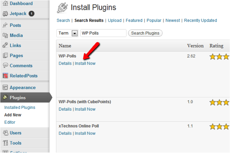 This is done by going to your dashboard, then click <“Plugins > then click Add New. Find WP-Polls and download. Then “Install” then click “Activate”.