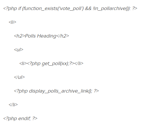 Where “xx” is your poll id of the poll that you have created. If you do not know PHP well, then I would suggest you to not mess with your themes code.