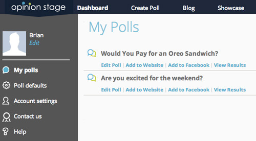 You must first create an account on Opinion Stage with a Facebook, Twitter or Google+ account. An account gives you a dashboard that allows you to easily see all the polls you have created.