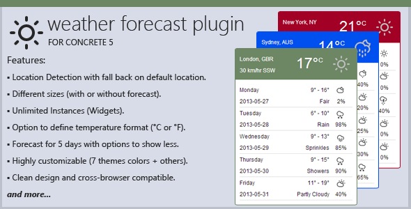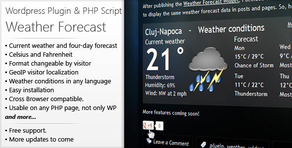 This weather application provides a sidebar widget and a short code system. These are used to embed weather forecasts anywhere on a WordPress powered website.