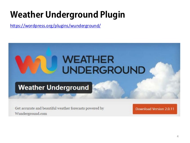 The fourth weather application on the list is the Weather Underground Plugin. The Weather Underground Plugin is one of the highest rated weather applications on WordPress. It is also one of the most widely used. It has numerous functions that make it useful such as its customizability.