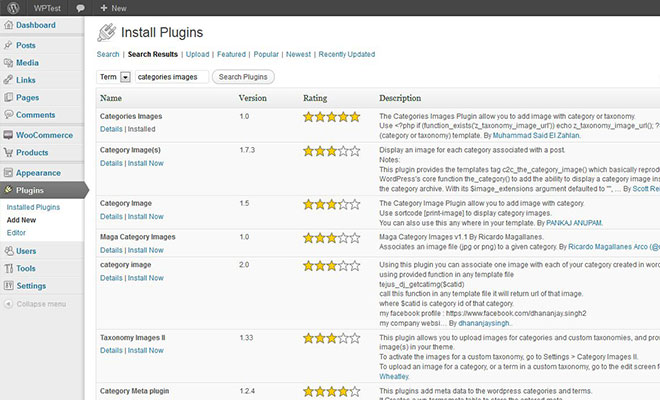Once the search has completed it should be the first plugin listed in the returned results. Now simply click Install Now and the Categories Images plugin will be installed.