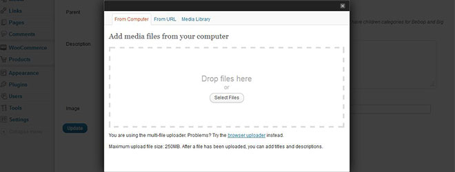 Click on the image upload field and you get a pop-up with the WordPress media manager panel where you can upload your category image.