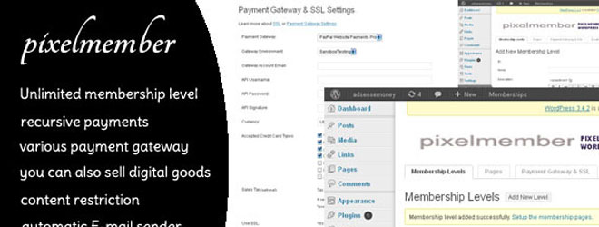 PixelMember is Membership Plugin for WordPress which allow you to : create membership level like silver / gold, give access of your content to only registered members, recursive payment, support many payment gateway like stripe ,PayPal express, PayPal pro ,authorize.net and other, you can also provide offline services to client, automatic page creation, automatic send email after registration to your site and much more