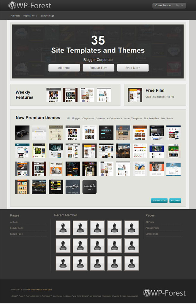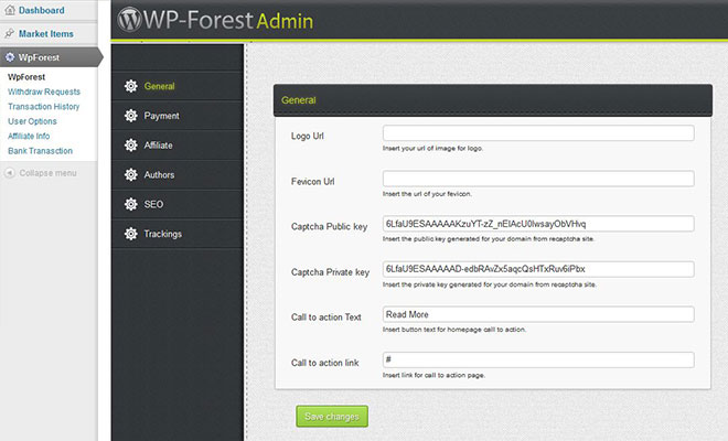 Members of your site can upload created themes or plugins to sell, you set a price for the item and take a percentage of the sale profits on each sold item. The percentage you earn from sold items works on a configurable sliding scale meaning your members who have sold a lot of themes pay you less sales commission than members who have only sold a small amount of themes who pay a higher commission. Below are some more features of the WPForest theme.